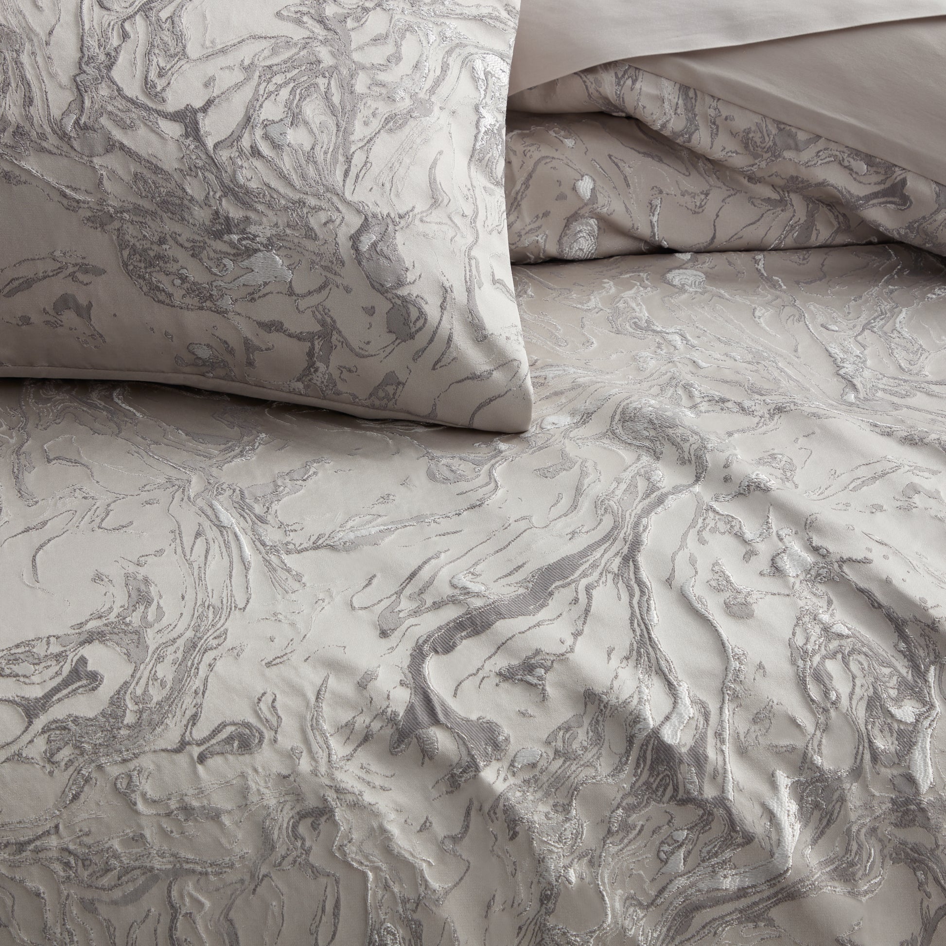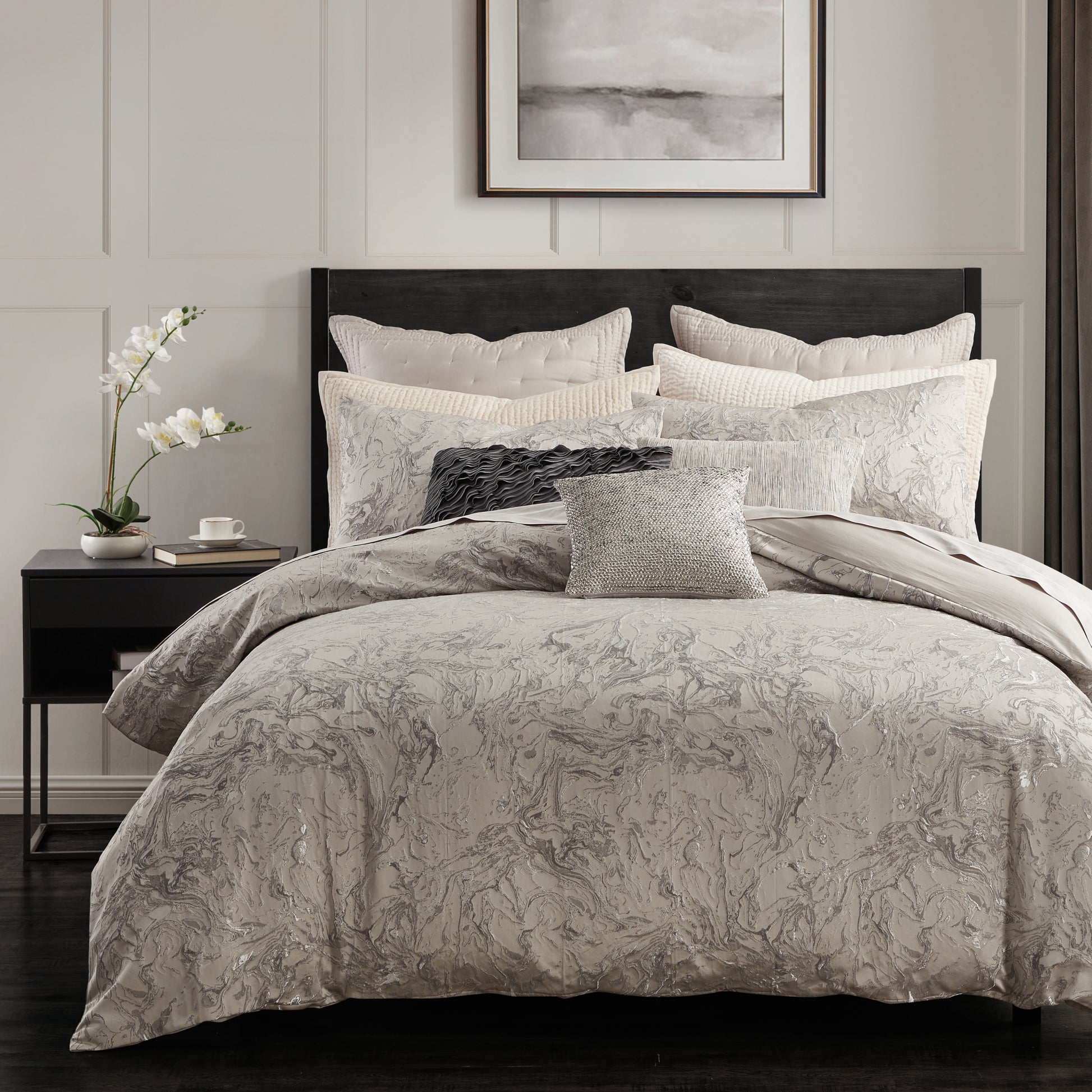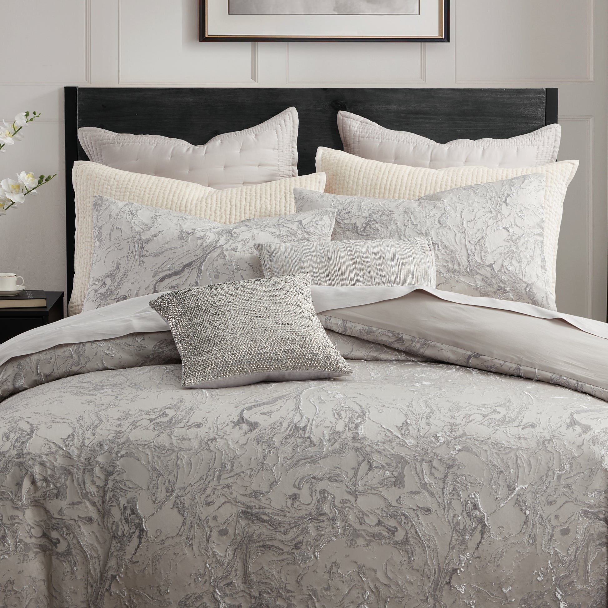 Get lost in the luxurious details found in the Liquid Marble Duvet by Donna Karan. Artfully designed with a mesmerizing marbling pattern on a jacquard glistening in a platinum hue reflecting a sense of timeless elegance. Thoughtfully wrapped in a vinyl-free box, making it perfect for gifting.