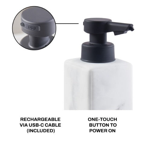 Elevate your handwashing experience with the DKNY Touchless Marble Sensor Pump. This sleek, automatic soap dispenser combines style and function for any countertop, with no installation needed. Just power it on with a simple one-touch button, adjust the soap volume, and enjoy the perfect amount of liquid soap every time—hands-free! Minimize the spread of germs while reducing plastic waste by refilling it with your favorite soap. The elegant marble design, crafted from durable resin, adds a modern touch to any bathroom or kitchen. Plus, it's conveniently rechargeable with a USB cord, so you can keep things clean and efficient.