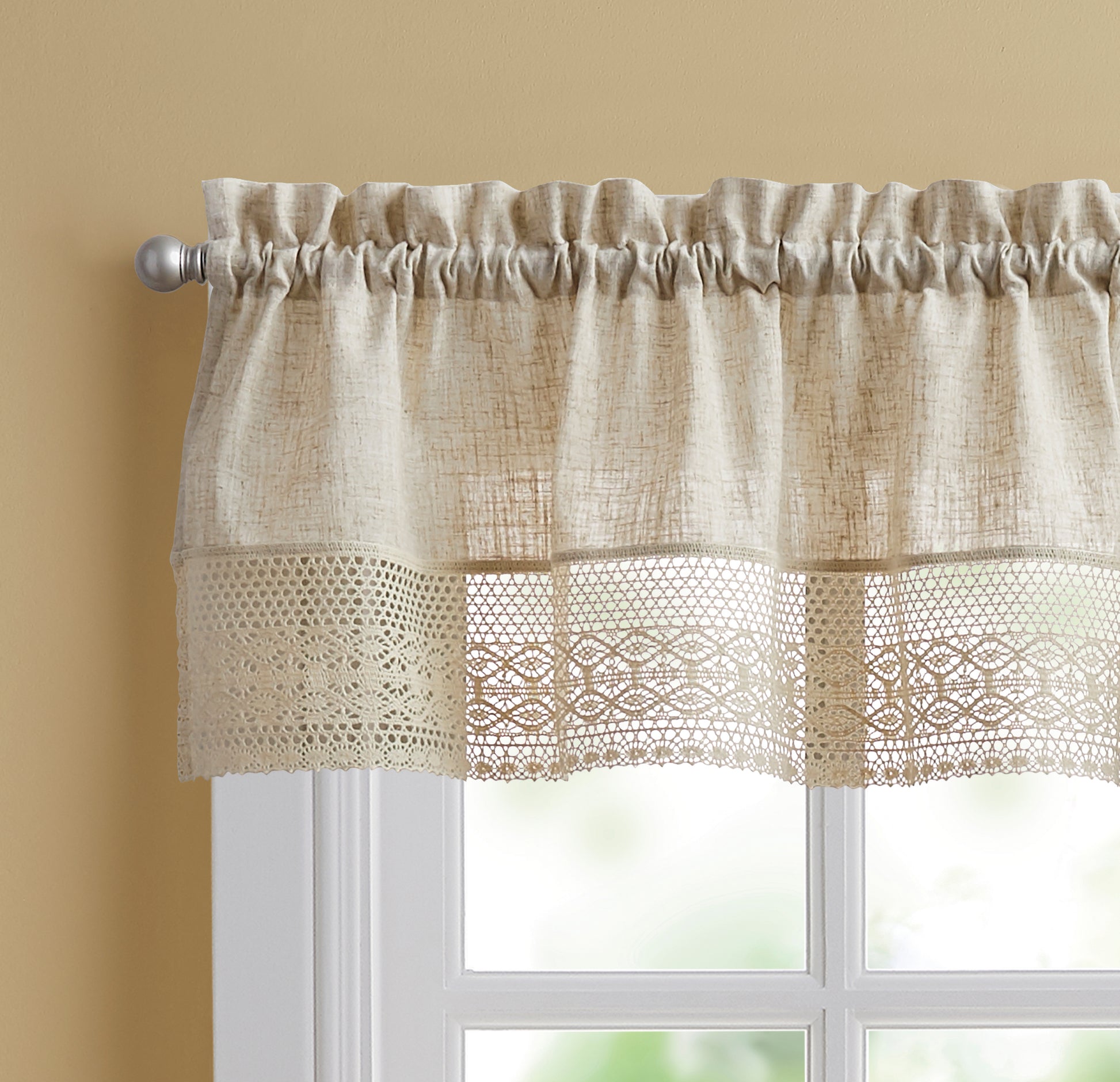 Bring a touch of timeless charm to your windows with the Bridget Tail Small Window Curtain. Crafted with a linen blend, this window accessory drapes beautifully while staying easy to care for. Delicate embroidery trim adds a subtle detail, making it an elegant accent for any room. Pair the Tiers with Valance for a coordinated look for your kitchen or cozy nook.