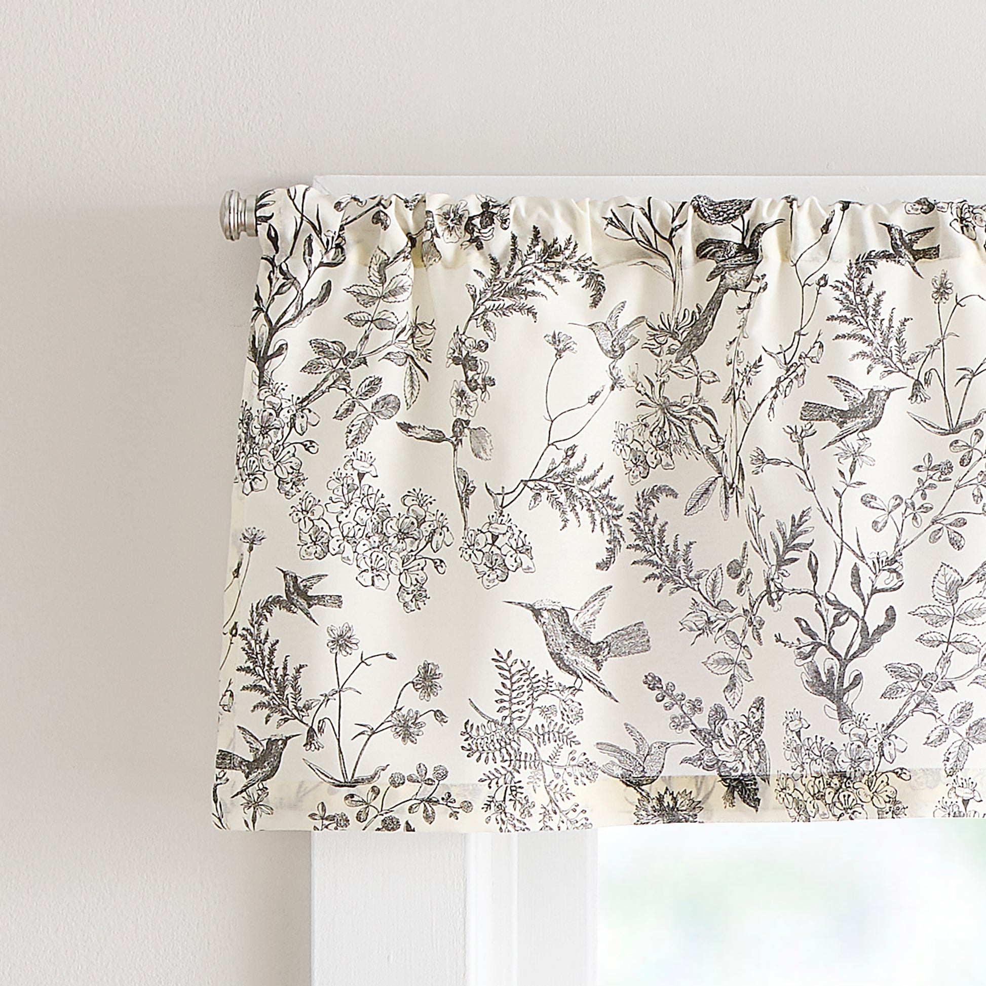Add charm to your small windows with the Curtainworks Hummingbird Valance and Tier Set. The white ground features a black pattern of lively florals and graceful hummingbirds, creating a sense of calm in your space. The classic color combination gives this 3-piece set a timeless appeal for kitchens, bathrooms, laundry rooms, or anywhere that could use a style update.