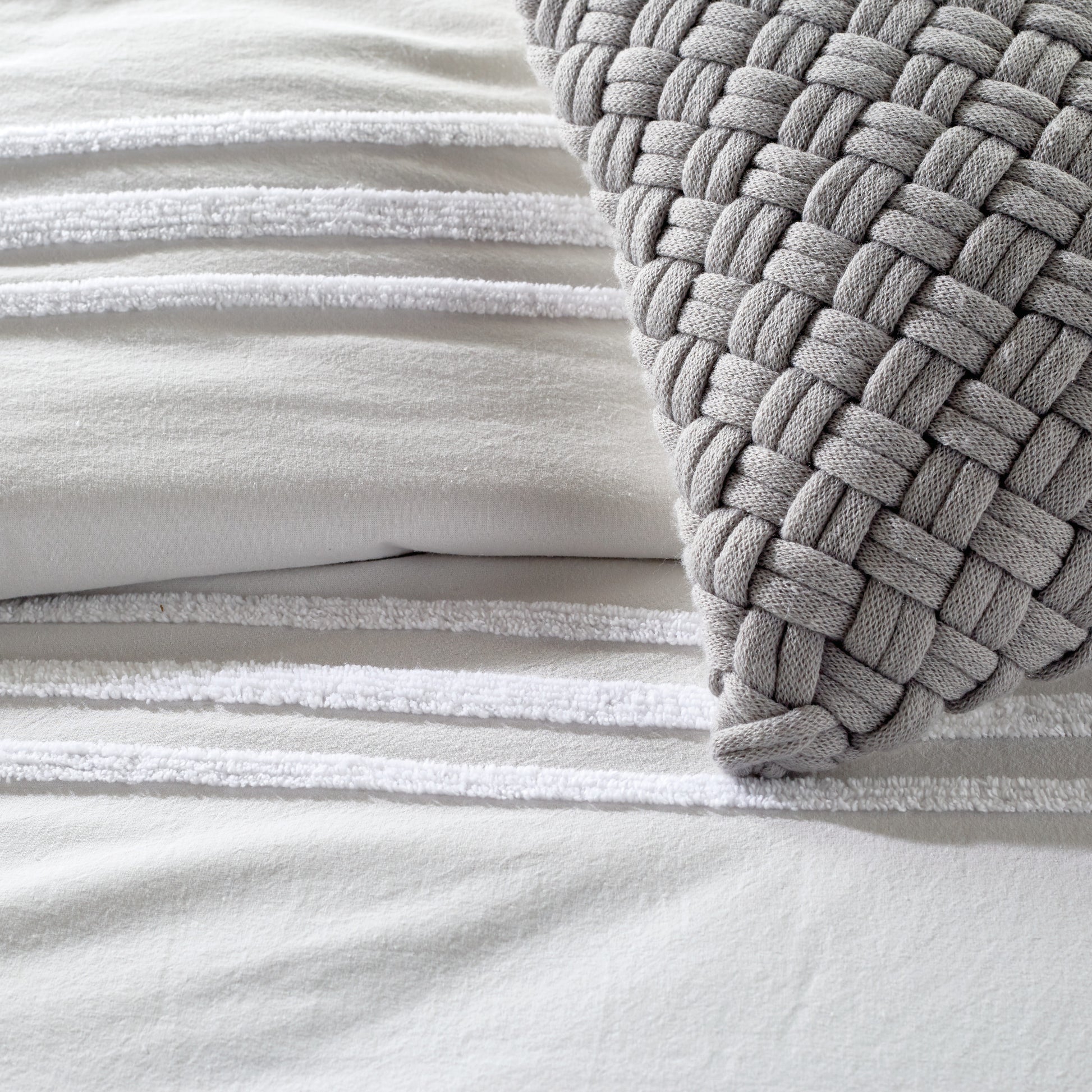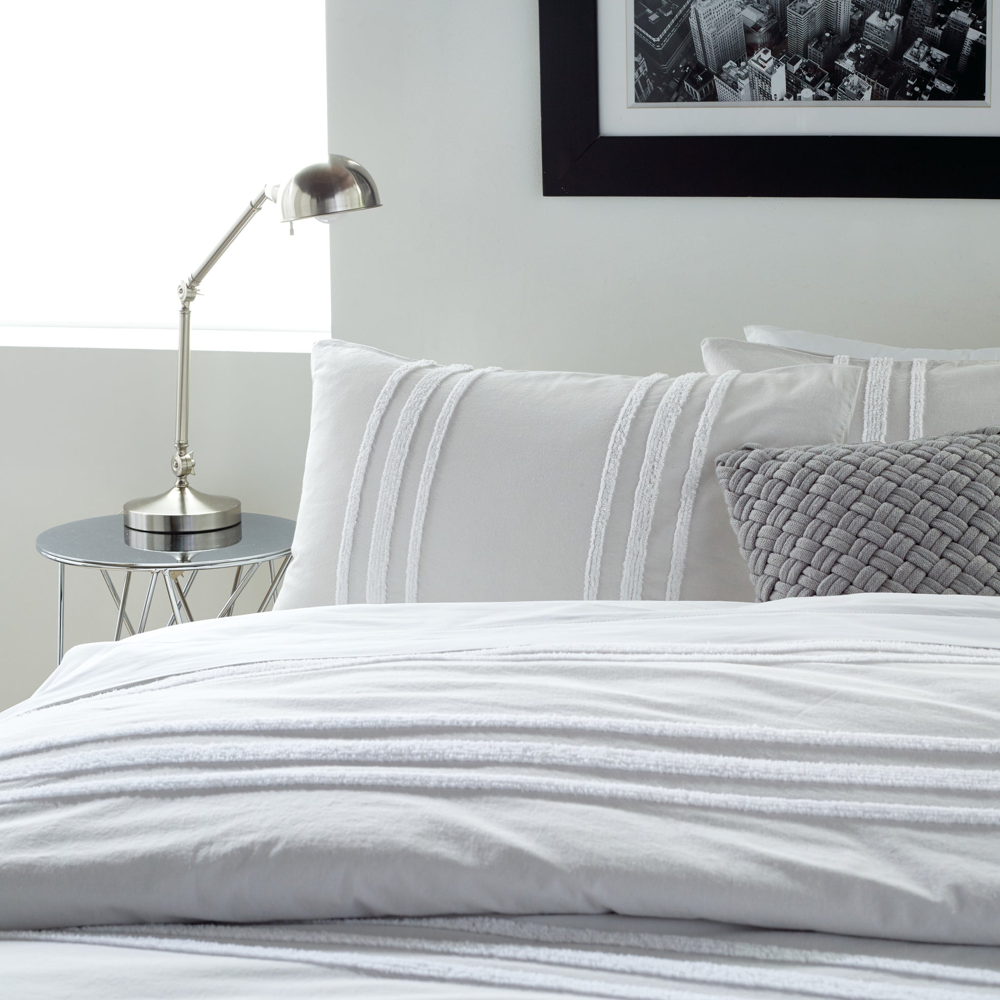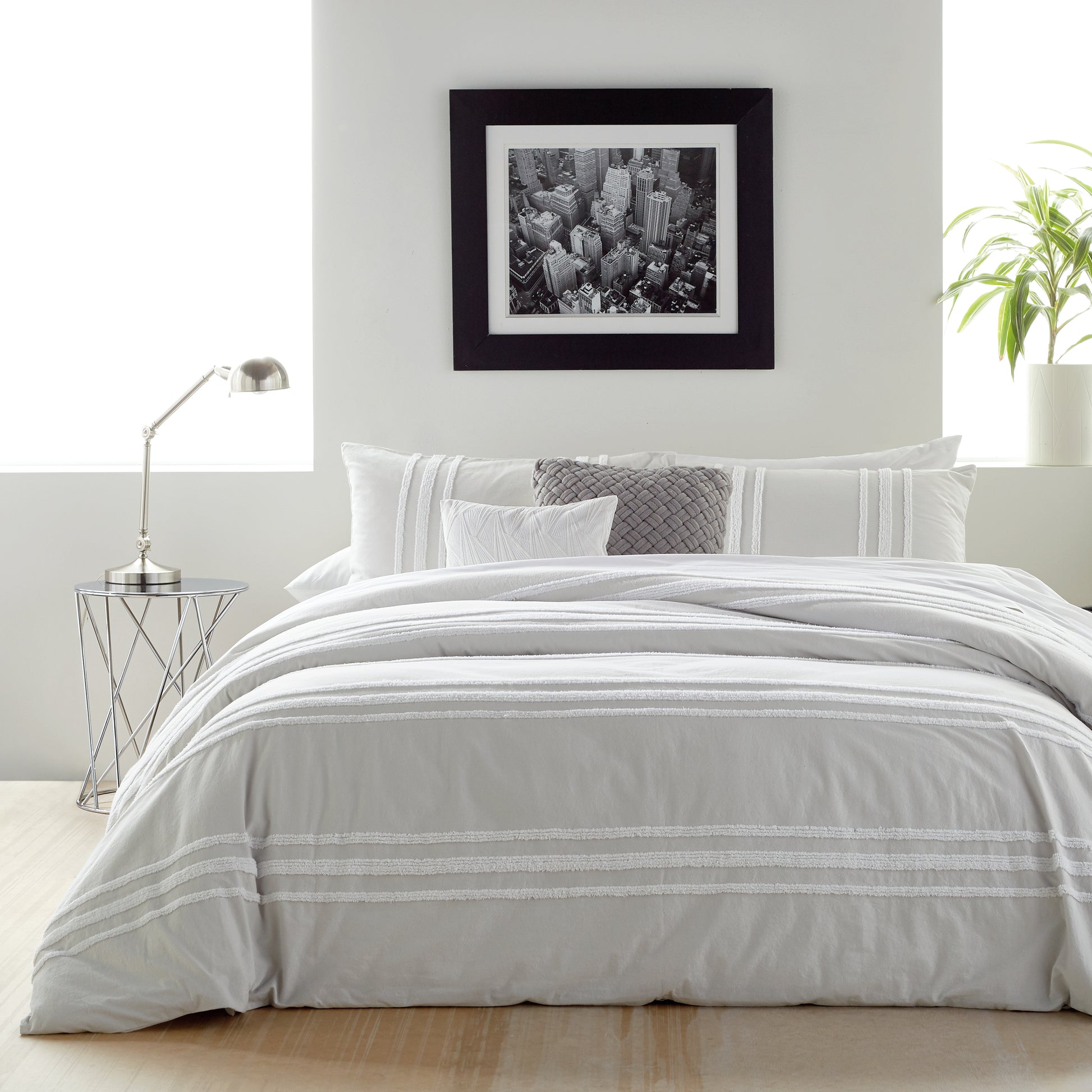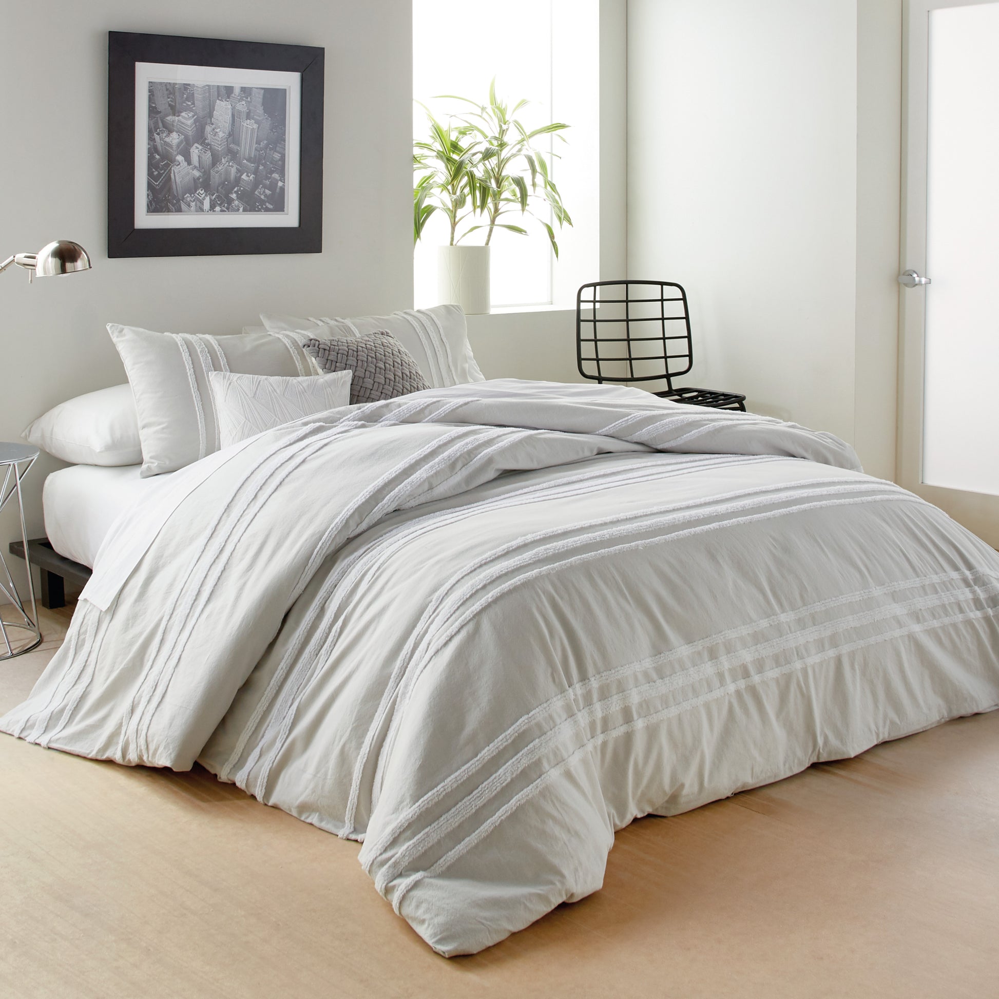 A modern take on a classic technique is presented in the DKNY Chenille Stripe Comforter Set. A horizontal white chenille stripe offers texture on a soft ground that gives a crisp presentation to this woven fabric, while the coordinating shams tie the ensemble together with their opposite vertical stripes. Available in two sizes of full/queen or king. Set includes one comforter and two shams.